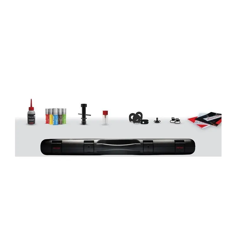 Пушките пристигат в луксозен черен куфар в комплект с масло, шокове-5бр., бутафорен патрон, антапки ,пластини за нагласяне ъгъла на приклада, ключ за куфара.